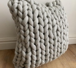 BULKY - tak nazywa się włóczka, która była inspiracja dla tego modelu. Ja od siebie dodałam akcent eco dzięki wrobionym ścinkom jeansu. Każda nowa poduszka jest inna i za razem niepowtarzalna. Całość wykończona ciekawym guzikiem ręcznej roboty.