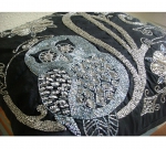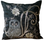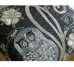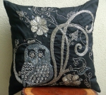 Poduszka uszyta z czarnego lnu i czarnego tiulu z naszytymi paseczkami ze strzępionej żorżety, które tworzą różnej wielkości owale, a przez to, unikalną kompozycję.
